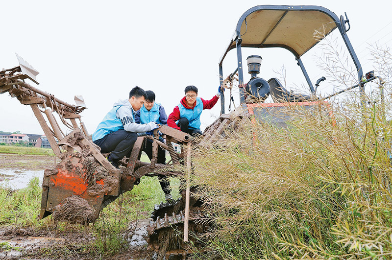 图为2023年4月29日,南华大学的大学生志愿者利用五一假期到湖南省衡阳市衡阳县西渡镇新桥村开展劳动助农行动,帮助农民检修、保养农机,用劳动实践助力乡村振兴。(新华社发 曹正平/摄)
